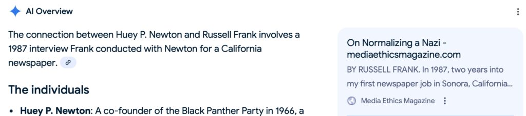 It’s as if AI did what any lazy/busy student would do: read the title and first graf, then skimmed the rest, thus mistaking The New York Times editor of the white nationalist profile for the editor of my Huey Newton profile and wildly mischaracterizing my profile as somehow marginalizing Huey as a Nazi-like figure.