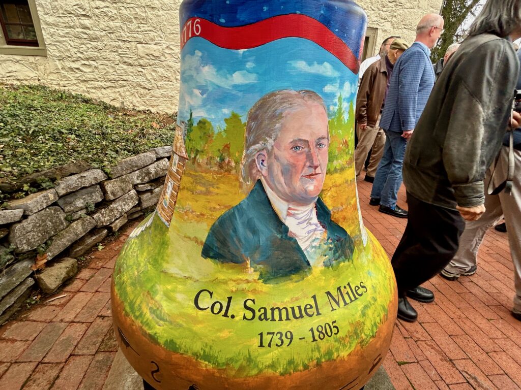 Working for weeks in a temporary studio at the mansion, Mathison painted the bell with the original two-story log house that stood on the site, Centre Furnace founders and Revolutionary War veterans Samuel Miles and Patton, and the furnace stack, which stands across Porter Road from the mansion as an artifact of the county’s history.