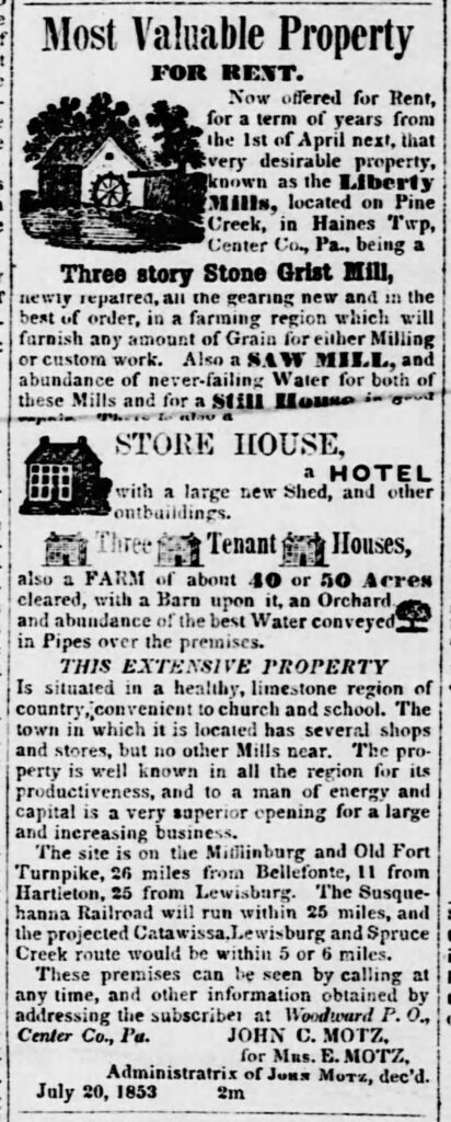 As a village developed around Motz family descendants, it was also known by the name of their properties, called Liberty Mills. An 1853 newspaper advertised that Liberty Mills was located on Pine Creek in Haines Township, Centre County. It had “never-failing” water for a stone gristmill and a sawmill, and had a still house in good repair. It also had tenant houses, farms, and a hotel along the Mifflinburg and Old Fort Turnpike. It was situated 26 miles from Bellefonte, 11 from Hartleton, and 25 from Lewisburg.[3] The town also temporarily adopted the name Taylorville in honor of Gen. Zachary Taylor circa 1848, right before his brief term as U.S. president.[4]